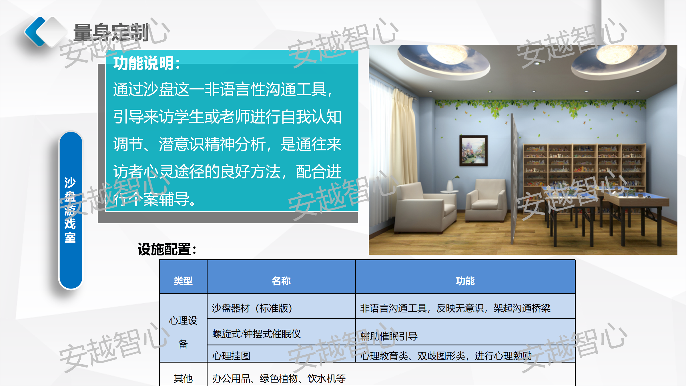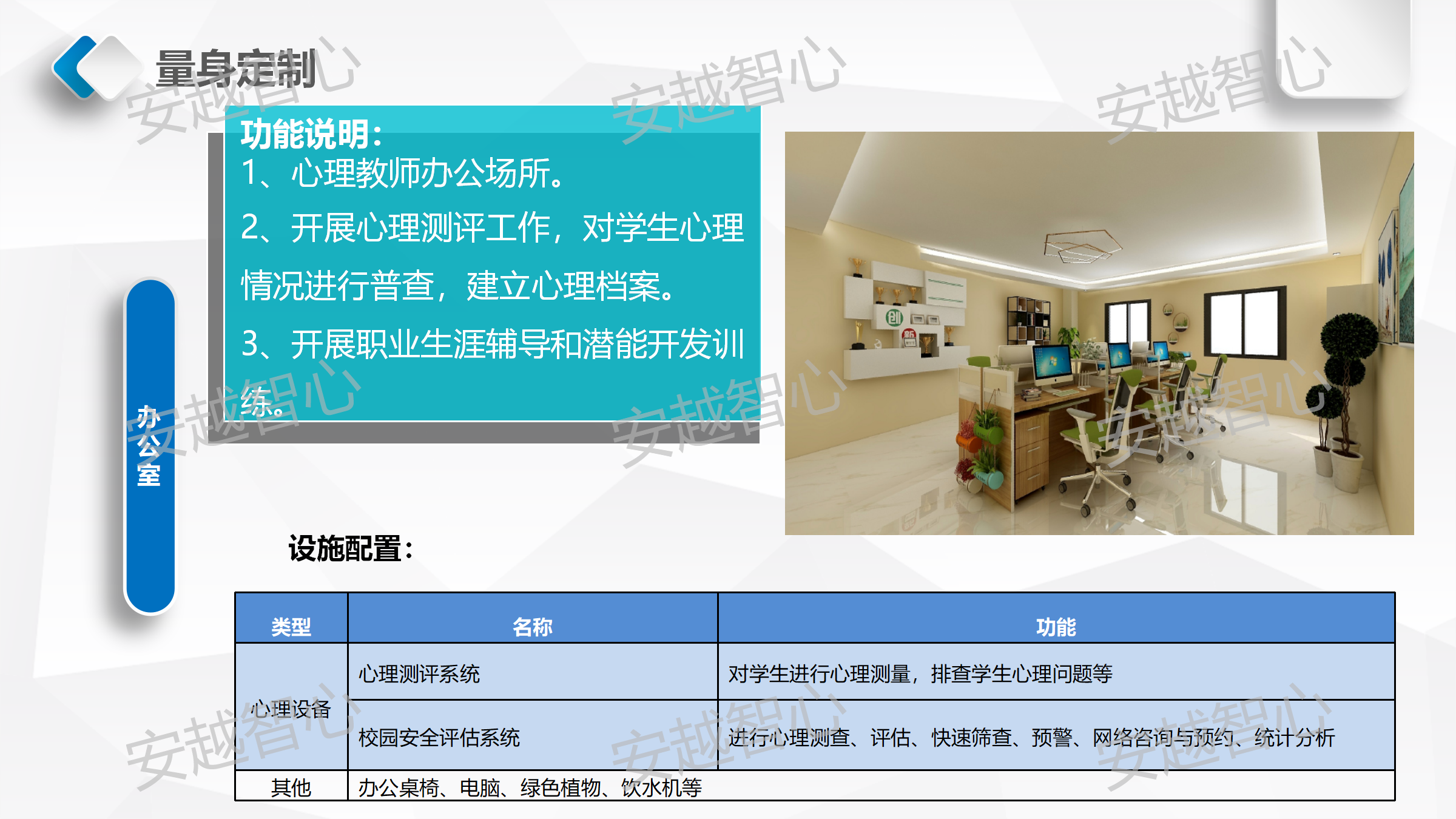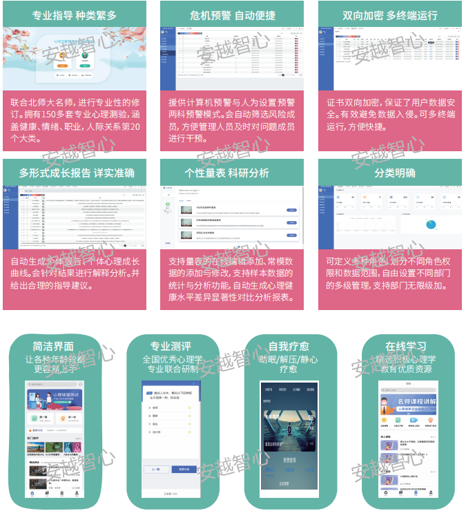 安越智心科技(云南)有限公司,是以促进心理行业发展为宗旨的软件开发及师资培训企业,我们整合行业资源提供高质量、创新的心理健康基地整体解决方案,搭建围绕“互联网+智慧心理+家庭教育”的服务体系,满足不同行业客户的各种需求。我们拥有一支技术娴熟、专业过硬、充满激情的开发团队和心理、家庭教育的专家队伍,同时有着十余年的学校实训室、软硬件设备、信息化的建设及系统集成的建设经验,为更好的服务心理健康教育领域奠定了良好的基础。